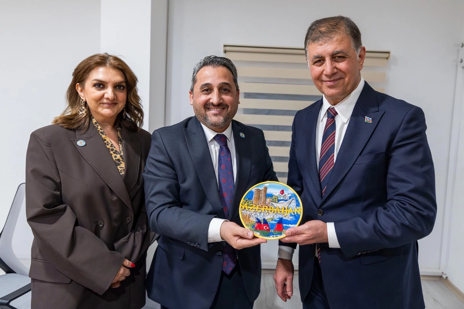 İZAZDER Başkanı Perviz Altay, ziyaretin sonunda Başkan Tugay’a Azerbaycan Cumhuriyeti bayraklı rozet taktı.