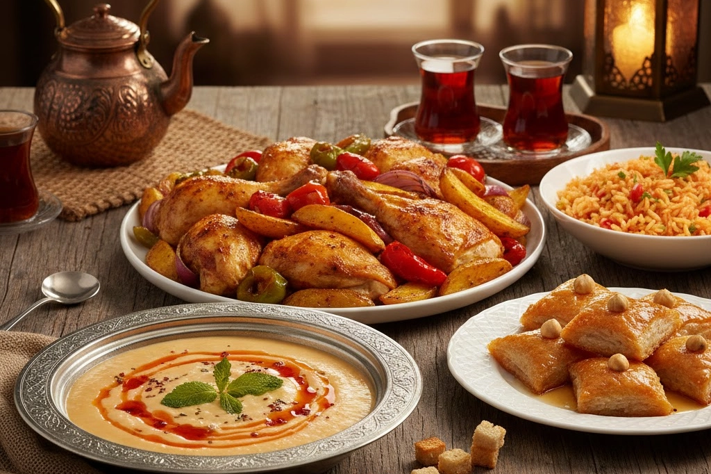 İşte 4 kişilik, pratik ve lezzetli bir iftar menüsü. Bu menüde domates çorbasından fırında sebzeli tavuğa kadar sofrayı zenginleştirecek tatlar bir araya geliyor. İftar Menüsü Hurma ve zeytin Domates çorbası Fırında sebzeli tavuk Bulgur pilavı Yoğurtlu semizotu salatası Kadayıf tatlısı Domates Çorbası Malzemeler 4 adet orta boy domates 1 yemek kaşığı tereyağı 1 yemek kaşığı un 4 su bardağı su veya tavuk suyu 1 çay bardağı süt Tuz Karabiber Yapılışı Tereyağı tencerede eritilir ve üzerine un eklenerek hafifçe kavrulur. Rendelenmiş domatesler eklenir ve birkaç dakika pişirilir. Ardından su veya tavuk suyu ilave edilerek karıştırılır. Çorba kaynamaya başladıktan sonra tuz ve karabiber eklenir. Son olarak süt ilave edilip birkaç dakika daha kaynatılır ve sıcak servis edilir. Fırında Sebzeli Tavuk Malzemeler 4 adet tavuk but veya baget 3 adet patates 2 adet havuç 1 adet kabak 1 adet soğan 3 yemek kaşığı zeytinyağı 1 yemek kaşığı salça 1 çay kaşığı kekik 1 çay kaşığı kırmızı toz biber Tuz Yapılışı Patates, havuç, kabak ve soğan iri parçalar halinde doğranır ve fırın tepsisine alınır. Tavuk parçaları sebzelerin üzerine yerleştirilir. Bir kapta zeytinyağı, salça ve baharatlar karıştırılır ve tavukların üzerine sürülür. Önceden ısıtılmış 200 derece fırında yaklaşık 40–45 dakika pişirilir. Bulgur Pilavı Malzemeler 2 su bardağı pilavlık bulgur 1 adet soğan 1 yemek kaşığı tereyağı 1 yemek kaşığı domates salçası 3 su bardağı sıcak su Tuz Yapılışı Soğan küçük küçük doğranır ve tereyağında kavrulur. Salça eklenip kısa süre daha kavrulur. Üzerine bulgur ilave edilerek karıştırılır. Sıcak su ve tuz eklenir. Kısık ateşte bulgur suyunu çekene kadar pişirilir ve dinlendirilerek servis edilir. Yoğurtlu Semizotu Salatası Malzemeler 1 demet semizotu 1 su bardağı yoğurt 1 diş sarımsak Tuz 1 yemek kaşığı zeytinyağı Yapılışı Semizotları iyice yıkanıp doğranır. Yoğurt, ezilmiş sarımsak ve tuz karıştırılır. Semizotları yoğurtla harmanlanır ve üzerine zeytinyağı gezdirilerek servis edilir. Kadayıf Tatlısı Malzemeler 300 gram tel kadayıf 100 gram tereyağı 1 su bardağı dövülmüş ceviz Şerbeti için 2 su bardağı şeker 2 su bardağı su Birkaç damla limon suyu Yapılışı Öncelikle şerbet hazırlanır. Şeker ve su kaynatılır, birkaç damla limon eklenip soğumaya bırakılır. Kadayıf elle didiklenir ve eritilmiş tereyağı ile karıştırılır. Yarısı tepsiye yayılır, üzerine ceviz serpilir ve kalan kadayıf eklenir. 180 derece fırında kızarana kadar pişirilir. Fırından çıkan sıcak tatlının üzerine soğuk şerbet dökülerek dinlendirilir. Bu menü, hem doyurucu hem de dengeli bir iftar sofrası hazırlamak isteyenler için pratik bir seçenek sunuyor. Özellikle sebzelerle zenginleştirilen fırında tavuk ve yanında bulgur pilavı, gün boyu süren orucun ardından vücudu yormadan enerji sağlayacak bir ana yemek alternatifi oluşturuyor.